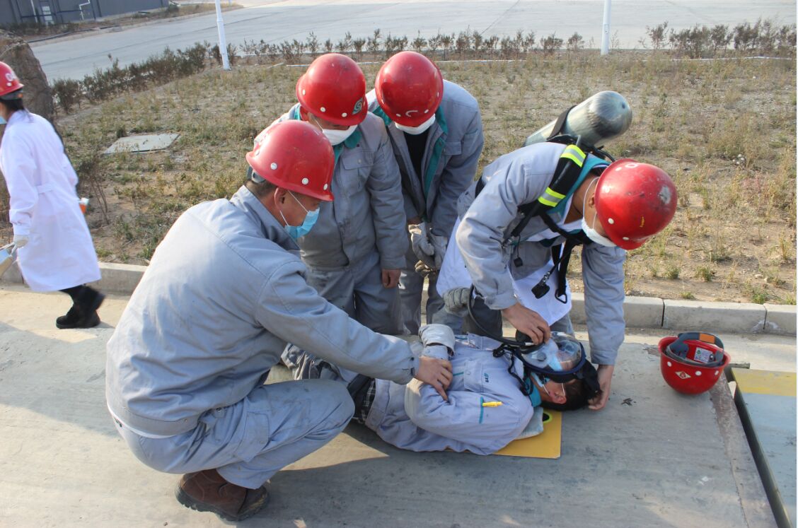 10:00,固化車間主管麻成龍、焚燒車間班長李世龍、楊曉偉將宮亮抬至上風方向陰涼處,對受傷人員采取緊急救助措施——佩戴空氣呼吸器,并詢問狀況,進行看護,等待救援車輛。